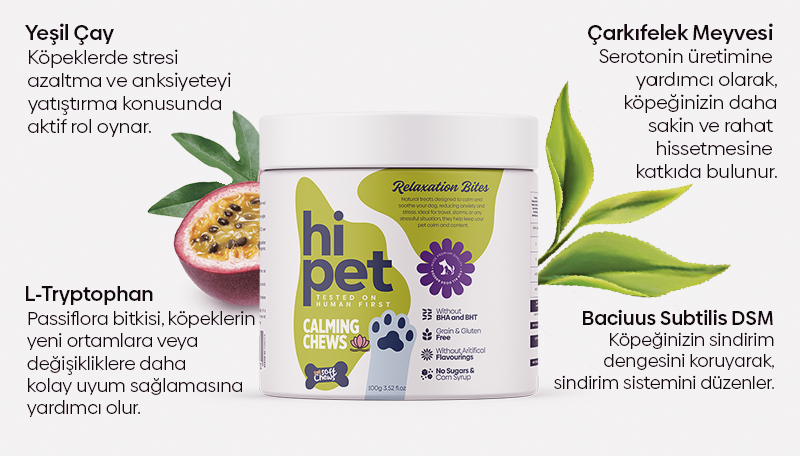 Kaygıları Yatıştırıcı HiPet Sakinleştirici Çiğnenebilir Tablet, içeriğinde çarkıfelek meyvesi sayesinde serotonin hormonunu arttırır. Bu köpeğinizin fırtına, havai fişek, araba yolculuğu veteriner ziyaretleri veya ayrılık kaygısı gibi durumlarda daha sakin ve rahat hissetmesine yardımcı olur.