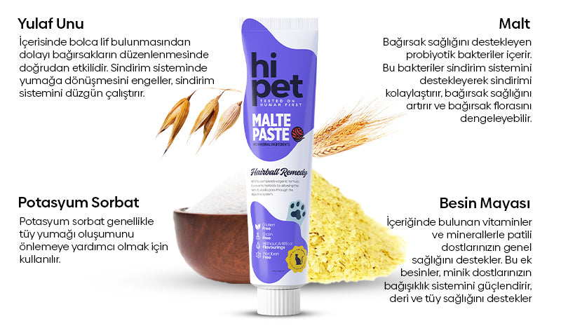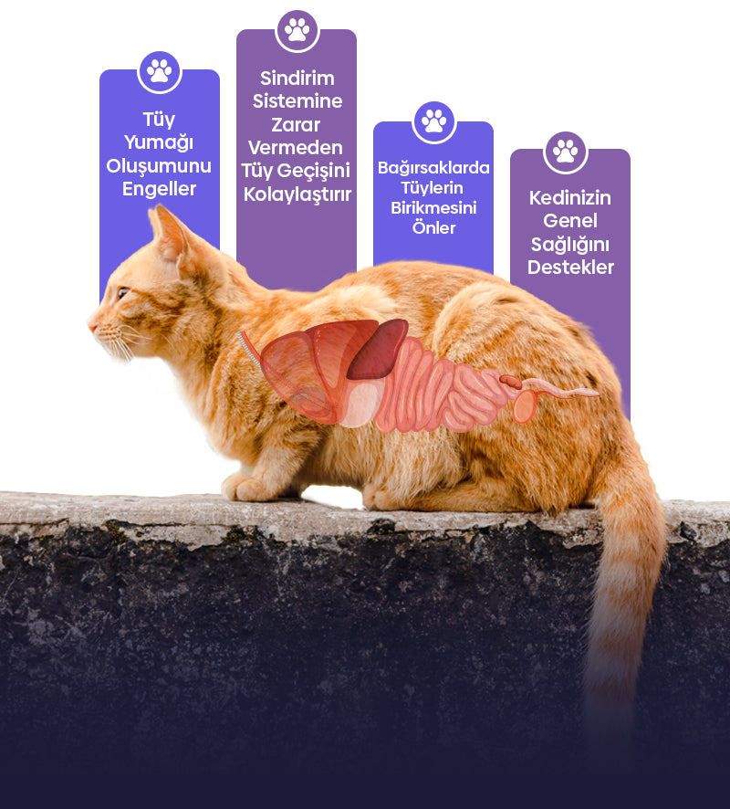 Tüylerin Sindirim Sisteminde Rahatça Geçişini Sağlar: Özel formülü, tüylerin mide ve bağırsaklarda düzgün bir şekilde geçmesini ve dışkı yoluyla atılmasını destekleyen bileşenler içerir.